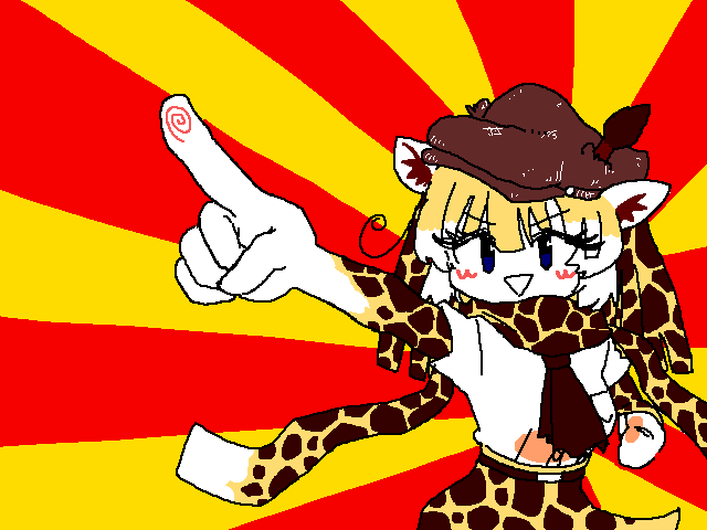 そしてこのイラストはアニメのアミメキリンちゃんでロッジに行く前、ギロギロのマネをしてパークに落ちていたボロボロの帽子を頭に乗せて!というイラストです。